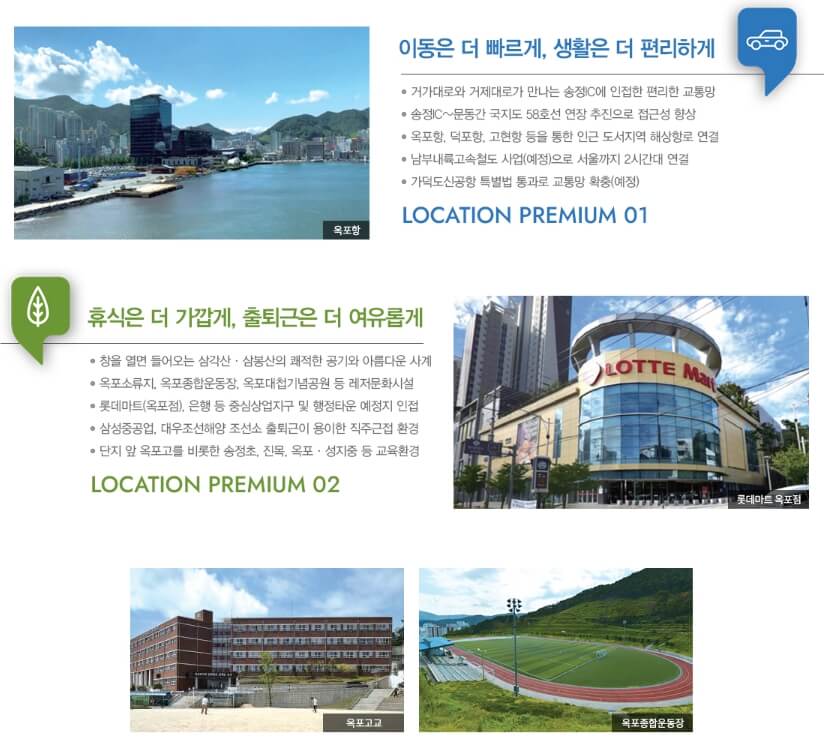 단지 인근에는 롯데마트와 옥포 국제시장, 다양한 레저 문화시설이 위치해 있어 입주민들에게 편리한 생활환경을 제공합니다. 또한, 삼각산과 삼봉산 등 녹지 시설이 풍부해 자연을 가까이에서 누릴 수 있는 쾌적한 환경을 자랑합니다.
