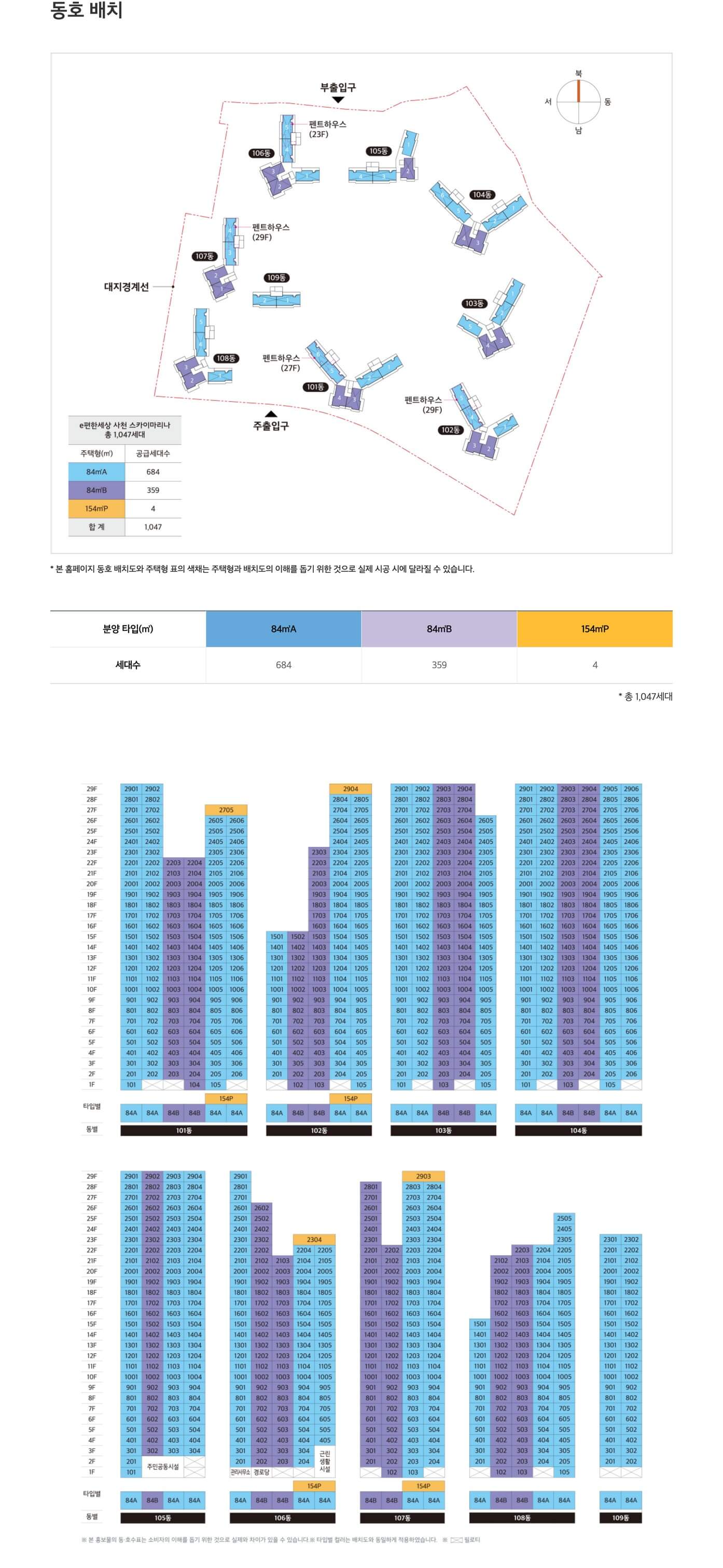 총세대수: 1047세대(84㎡A형/684세대, 84㎡B/359세대/154㎡P형/4세대) 주차대수: 1,581대(근생 6대 포함)