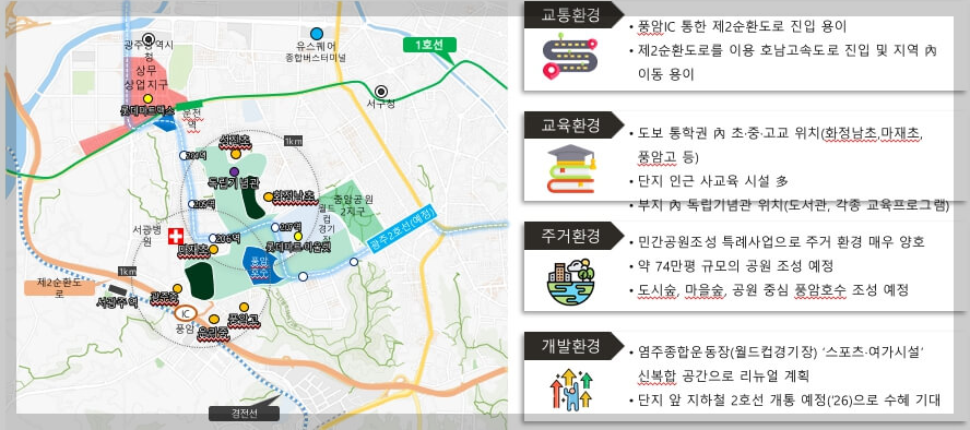 이 단지는 광주 중심 상권인 상무지구와 인접해 있어 생활의 편리함을 극대화합니다. 롯데아울렛, 롯데마트 등 다양한 상업시설이 가까이 위치해 있으며, 초·중·고등학교가 인근에 있어 자녀를 둔 가정에 매우 유리합니다. 화정남초, 화개초, 풍암고 등 명문 학군이 가까워 자녀 교육에 있어 최적의 환경을 제공합니다.