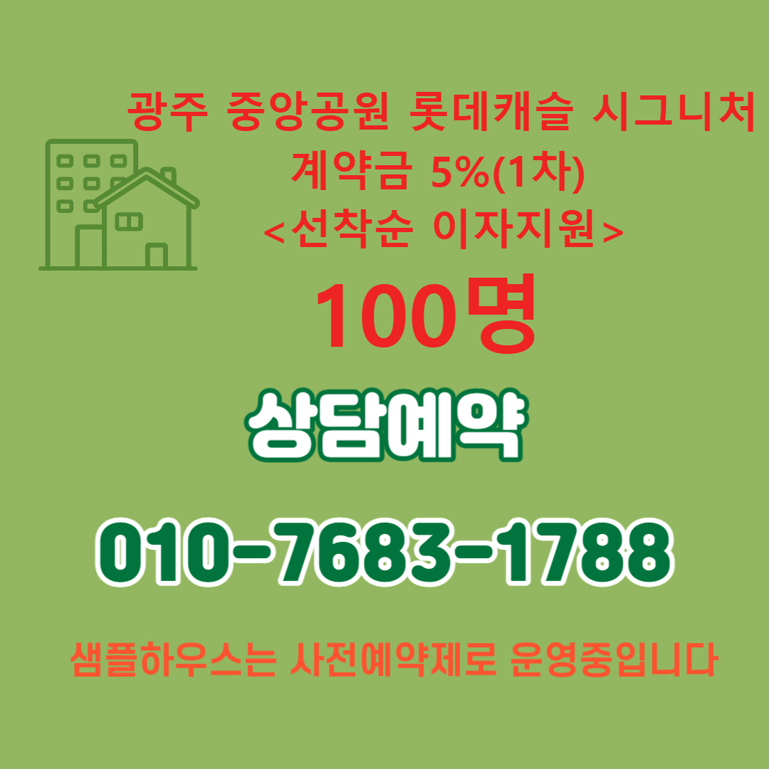 현재 광주 롯데캐슬 시그니처의 모델하우스가 오픈한 상태입니다. 광주뿐만 아니라 전국적으로도 브랜드 이미지가 좋은 롯데캐슬인 만큼, 모델하우스에서는 광주 롯데캐슬 시그니처만의 프리미엄을 경험해 볼 수 있습니다. 청약통장을 이용하지 않아도 선착순으로 계약이 진행되기 때문에, 내 집 마련을 고려하는 이들에게는 절호의 기회라 할 수 있습니다.