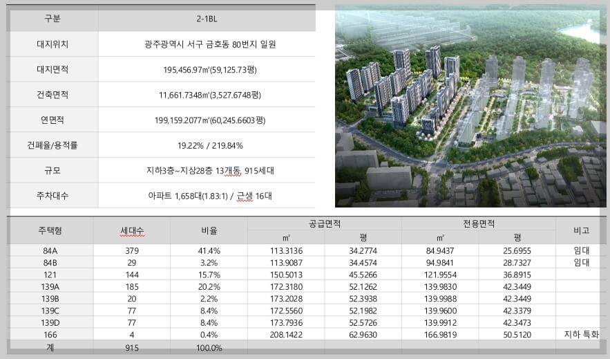 중앙공원 롯데캐슬 시그니처는 광주 서구 금호동 일대에 위치하며, 지하 3층에서 지상 28층까지 총 39개 동으로 구성 된 대단지 아파트입니다. 전용면적 84233㎡의 다양한 평형대의 총 2,772세대가 입주할 예정이며, 이 중 2,364세대가 일반 분양됩니다. 단지는 총 3개 블록으로 나뉘어 조성되며, 1BL(929세대, 전용 114233㎡), 2-1BL(915세대, 전용 121166㎡), 2-2BL(928세대, 전용 84166㎡)로 구성됩니다.