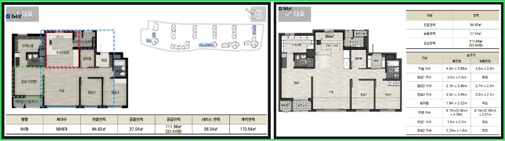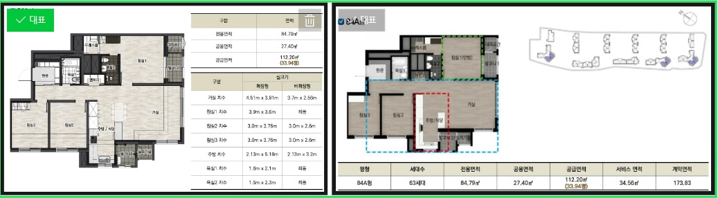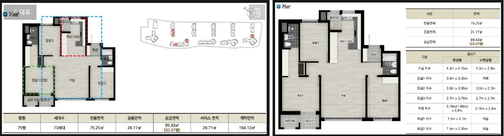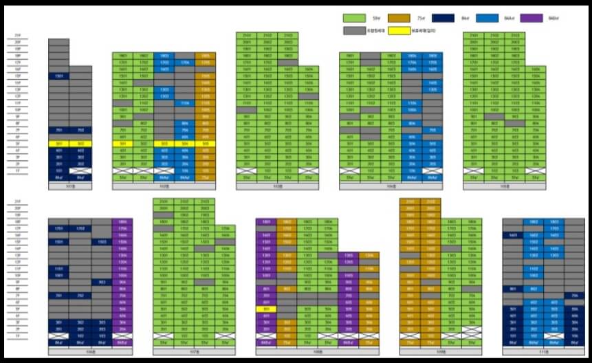 이 아파트는 다양한 평형 타입을 제공합니다. 59평(78.99㎡), 75평(99.43㎡), 84평(111.88㎡), 84A평(112.20㎡) 등 다양한 선택지를 통해 고객들의 다양한 입맛과 요구를 만족시킵니다.
