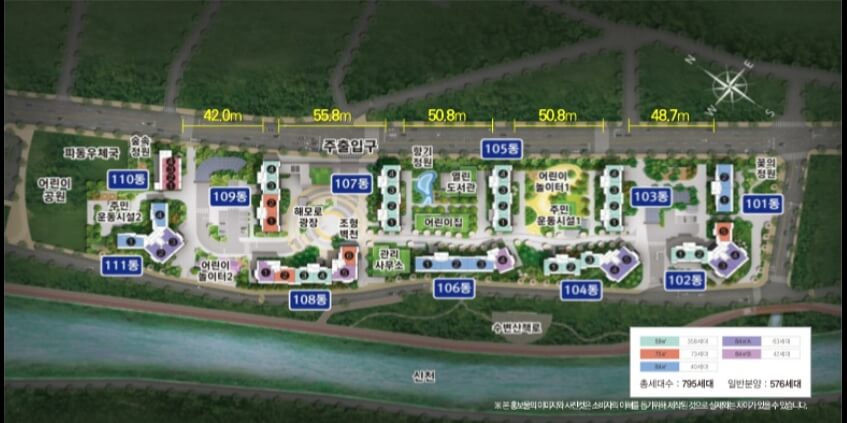 해모로 하이엔은 신천과 법이산을 한 폭의 그림처럼 감상할 수 있는 조망을 제공합니다. 넓은 인동거리(55.8m)를 확보하여 주거 환경을 더욱 풍부하게 만들어줍니다.