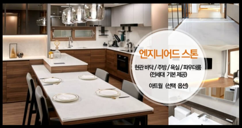 내장재로는 고품격 스톤 내장재를 적용하여 고품격 실내 분위기를 조성합니다. 현관 바닥, 거실 아트월, 주방, 욕실 파우더룸 등은 프리미엄급 시공으로 제공되어 고객들의 품질에 대한 요구를 충족합니다.