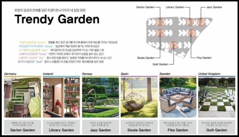 - 유럽 감성 테마 정원: 6가지 유럽 스타일의 테마 공간을 단지 곳곳에 배치하여 휴식과 산책을 즐길 수 있습니다.