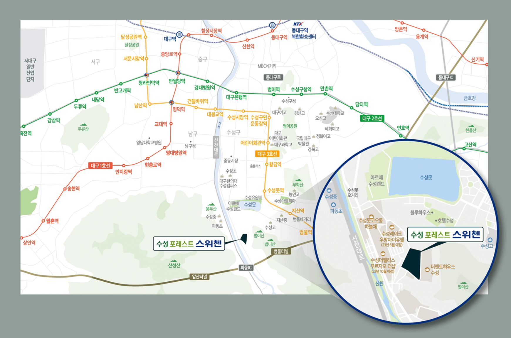 수성 포레스트 스위첸은 파동 IC 바로 앞에 위치해 뛰어난 교통 접근성을 자랑합니다.