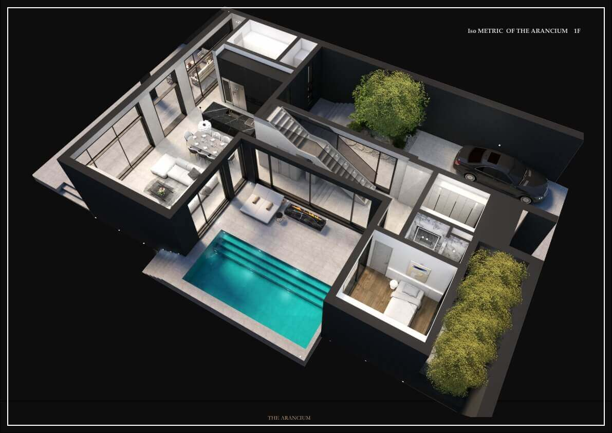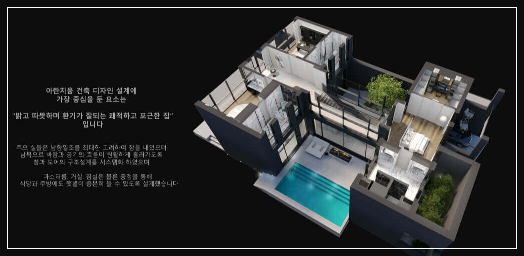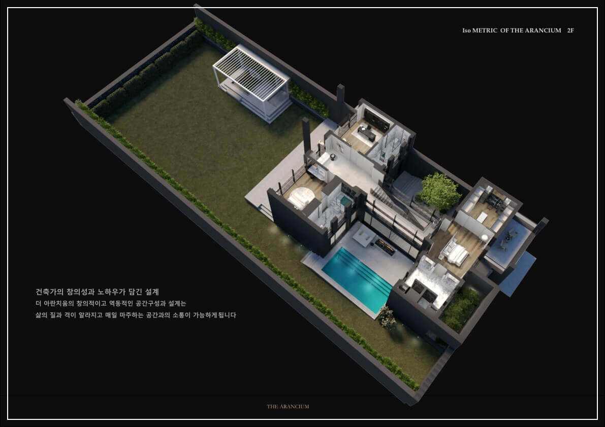 더 아란치움의 실내 설계는 채움과 나눔의 효율적인 공간 구성을 통해 가족 구성원의 프라이버시와 생활 편의를 최대한 고려하였습니다. 1층의 방과 수영장, 정원으로 이어지는 편리한 동선은 입주민들이 넓고 편안한 생활을 할 수 있도록 배치되었습니다. 거실과 주방, 수영장, 정원까지 이어지는 열린 공간은 자연과 소통하며 즐거움과 편안함을 동시에 누릴 수 있습니다.