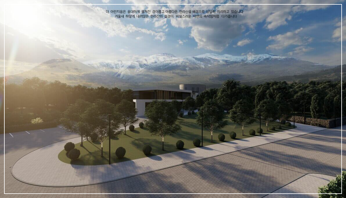 더 아란치움은 웅대하게 펼쳐진 경이롭고 아름다운 한라산을 배경으로 당당히 자리하고 있습니다. 겨울새 하얗게 내려앉은한라산의 설경이 비밀스러운 자연의 속삭임처럼 다가옵니다.