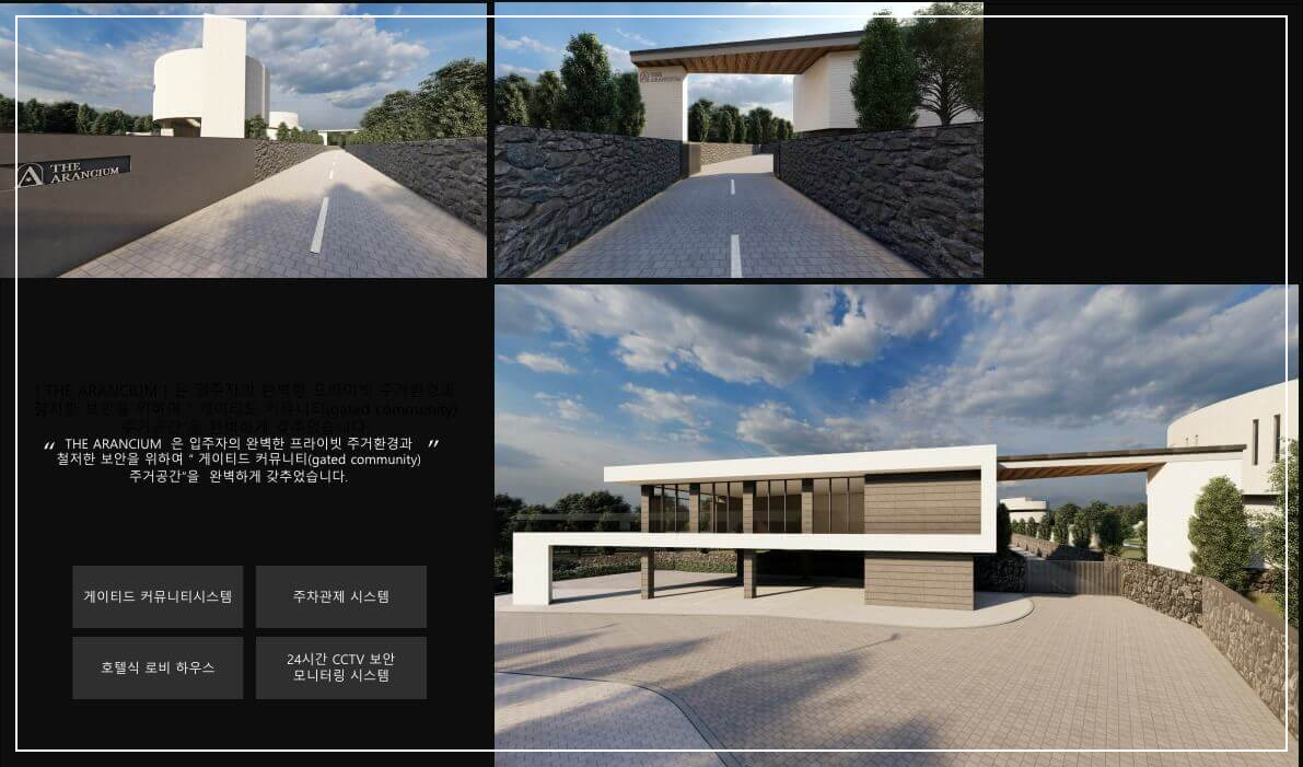 더 아란치움은 프라이빗한 주거환경을 중시하는 입주민을 위해 ‘게이티드 커뮤니티(gated community)’ 시스템을 도입했습니다. 전용 출입로는 외부인의 출입이 불가하며, 24시간 CCTV 보안 시스템과 상근 경비 보안 요원이 철저한 보안을 책임집니다. 이러한 보안 시스템은 ‘제주도 고급 타운하우스’에서 기대할 수 있는 최상의 프라이버시를 보장합니다.