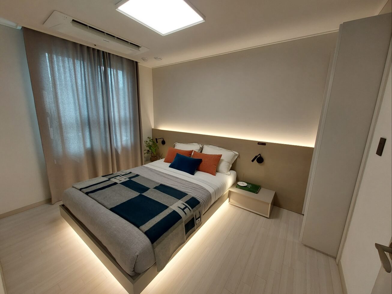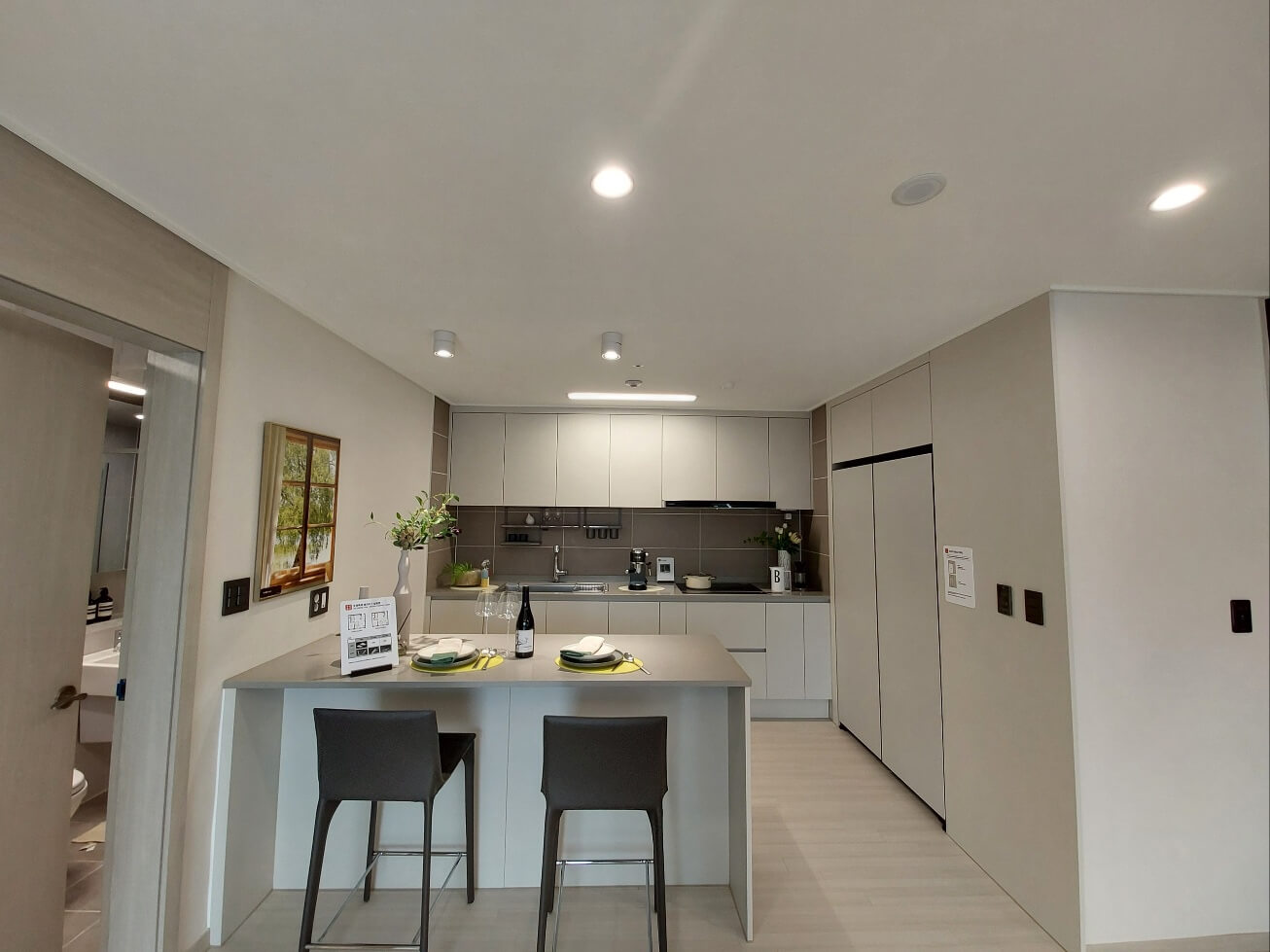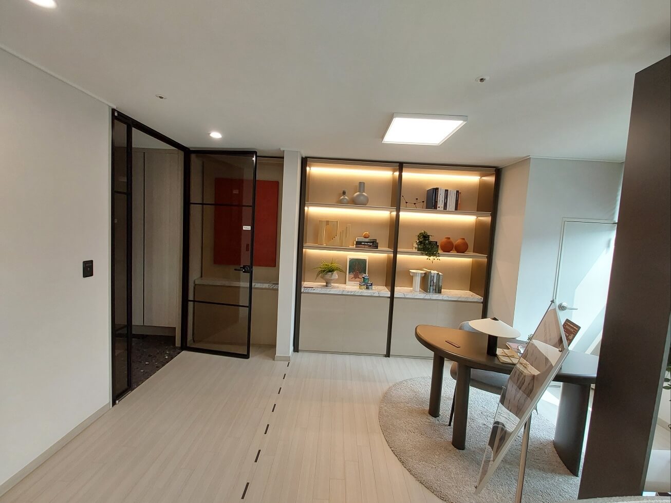실제 구조를 보면 ‘소형이라서 불편하다’라는 고정관념을 완전히 깨는 디자인이 특징입니다. 세대 내부는 거실 또는 세컨드룸을 자유롭게 활용할 수 있는 오픈형 가변공간으로 배치되어 있으며, 샤워·세탁·건조까지 한 번에 해결되는 원스톱 욕실 시스템, 우물천장 기준 2.5m의 길게 뻗은 천장고, 일부 세대의 테라스·복층 구성이 마련돼 있습니다.