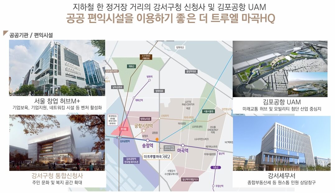 더 트루엘 마곡 HQ 는 5호선 송정역, 9호선 공항시장역을 모두 도보권에서 이용할 수 있는 진정한 더블역세권 구조로 설계되었습니다. 송정역을 이용하면 단 한 정거장 만에 김포공항역으로 이동할 수 있어, 5개 노선으로 즉시 연결되는 광역형 교통망을 누릴 수 있습니다. 출퇴근뿐 아니라 출장·여행·업무 이동까지 모든 동선의 가치를 높여주는 입지입니다. 이 구간은 실제로 서울에서 가장 이동 편의가 뛰어난 지역 중 하나로 평가받습니다.