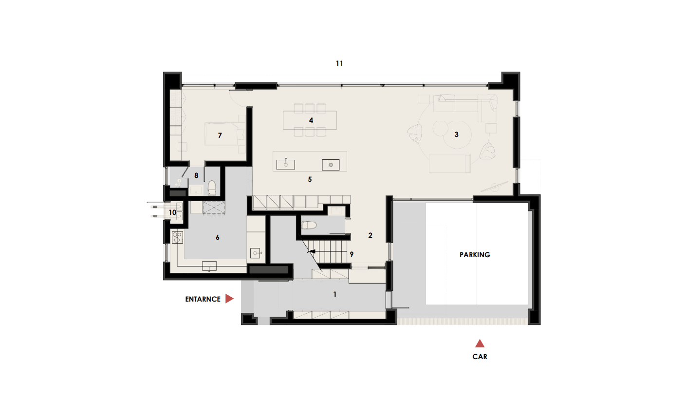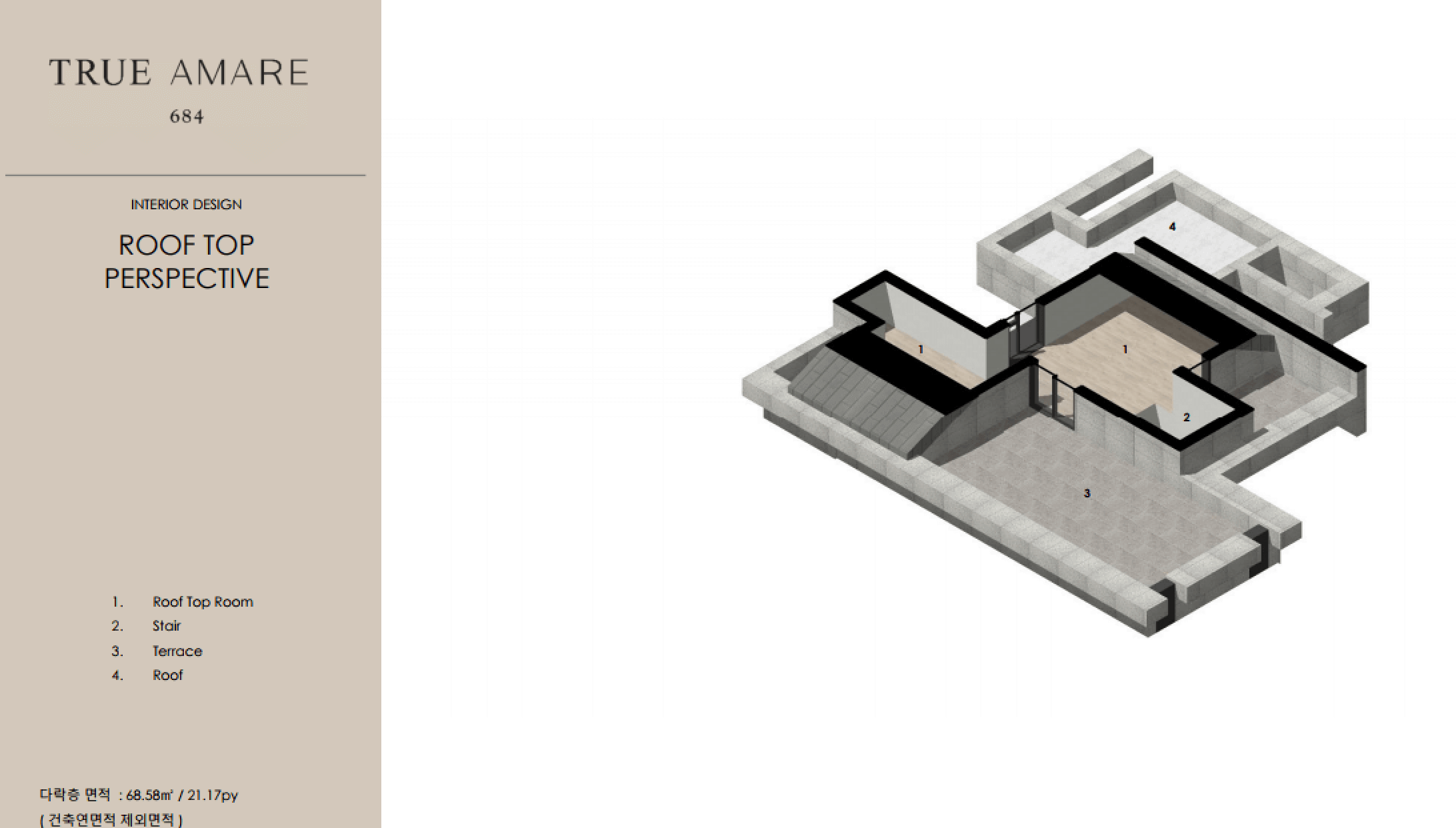 1층: 주방, 거실, 방 1개, 욕실 1개, 보조 주방 2층: 거실, 방 3개, 욕실 3개, 테라스 3층: 다락방, 테라스