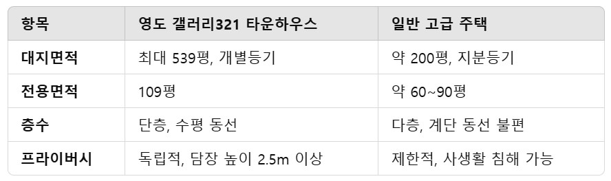 영도 갤러리 321 타운하우스는 기존의 고급 주택과 비교할 수 없는 독보적인 특징을 가지고 있습니다.