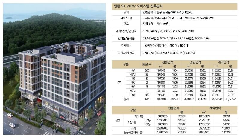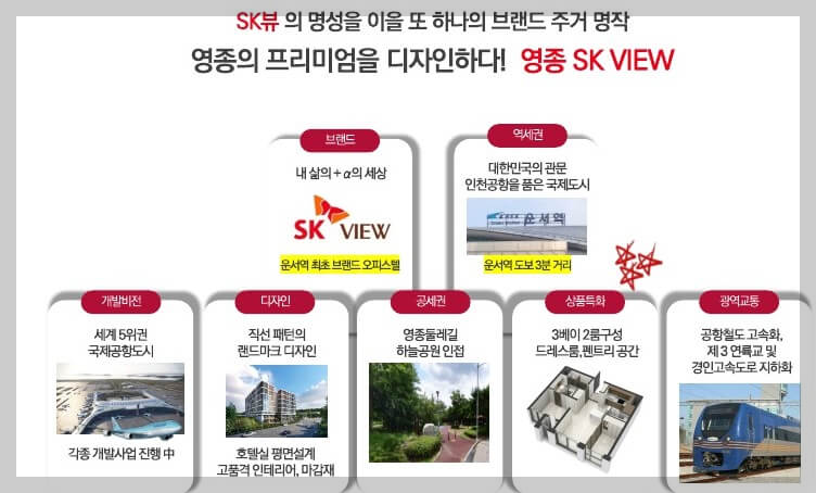 영종 SK뷰는 중심상업지구와 인접한 위치에 있어 중소형 평형의 고급 오피스텔로, 주변에는 영종하늘도시 1·2호 근린공원과 영종둘레길 1코스가 있어 거주성을 높여주고 있습니다. 또한, 영종국제도시는 다수의 리조트와 테마파크가 개발 중이며, 엔데믹 이후에는 관광객 및 관련 업계 종사자 등의 수요가 늘 것으로 예상되어 미래 발전가치가 높다고 볼 수 있습니다.