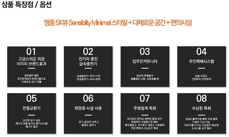 영종 SK뷰는 현대적이고 고급스러운 디자인의 오피스텔로, 지하 5층과 지상 10층으로 이루어진 2개 동에 총 432호실이 조성되어 있습니다. 직선 패턴의 외관과 실용적인 설계로 구성된 이 오피스텔은 최상층 일부 호실에는 야외테라스와 다락공간이 제공되어 특별한 공간을 즐길 수 있습니다. 전 호실이 1.5룸부터 2룸까지의 중소형 평형으로 구성되어 있어 편의성과 실용성을 갖추고 있습니다. 2개 동 사이에는 중앙정원이 구축되어 입주민들에게 안락하고 평온한 휴식을 제공하며, 옥상에는 영종도의 아름다운 경치를 감상할 수 있는 옥상정원도 마련되어 있습니다. 환경 친화적인 설계를 강조하여 옥상 태양광과 외장 일체형 태양광발전시스템(BIPV)을 도입하여 신재생에너지를 적극 활용합니다.
