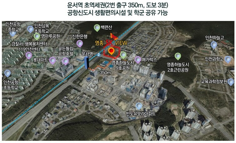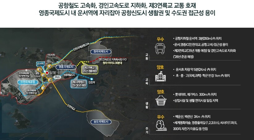 위치적으로는 공항철도 운서역 인근에 있어 서울역, 홍대입구 등 도심으로의 이동이 수월하며, 인천공항과 김포공항으로의 이동도 편리합니다. 뿐만 아니라 제2경인고속도로와 인천대교, 영종대교 등을 통해 2025년 개통 예정인 제3연륙교를 통해 수도권으로의 이동이 원활할 것으로 기대됩니다.