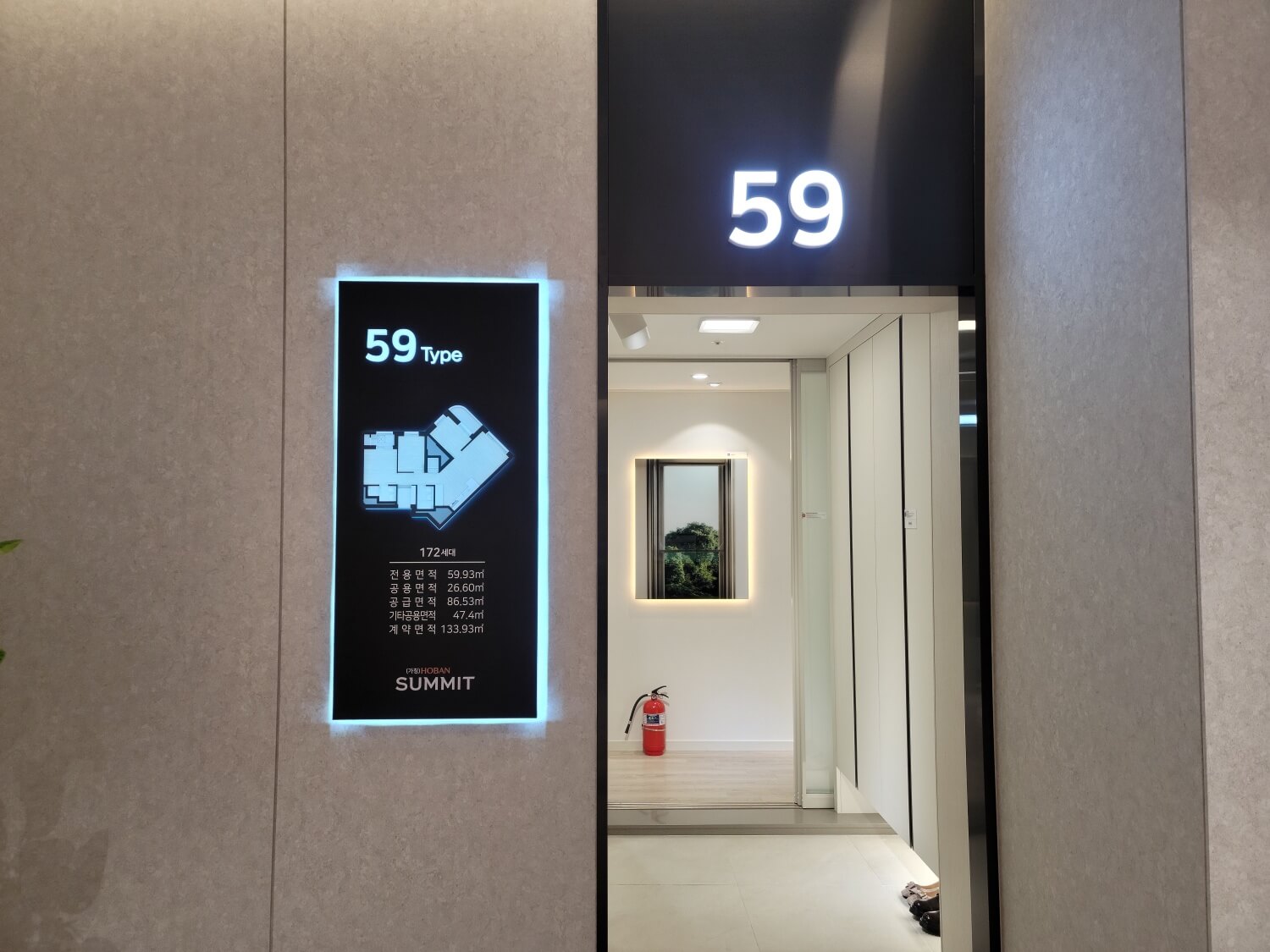 59㎡는 신혼부부나 1인 가구를 위한 소형 평형으로, 3Bay 구조와 독립적인 생활공간을 제공합니다. 현관에서 내부가 바로 보이지 않는 설계로 프라이버시를 강화했습니다.