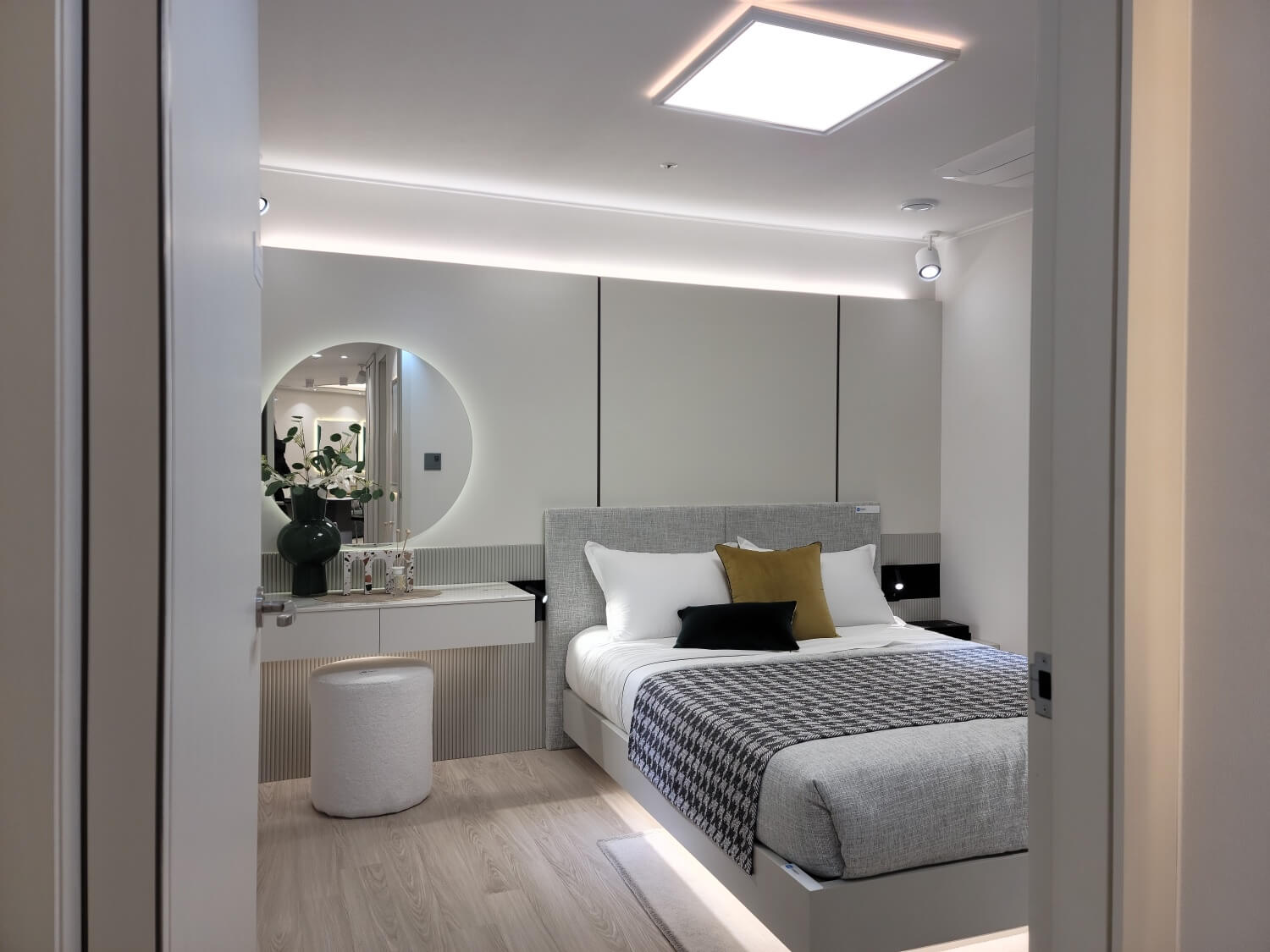 84㎡ A, B, C 타입은 국민 평형으로 지속적인 인기를 누리고 있습니다. 이들 타입은 양면 빌트인 신발장, 다용도실, 드레스룸 및 파우더룸 등 수납공간이 강화되어 개방감을 극대화합니다.