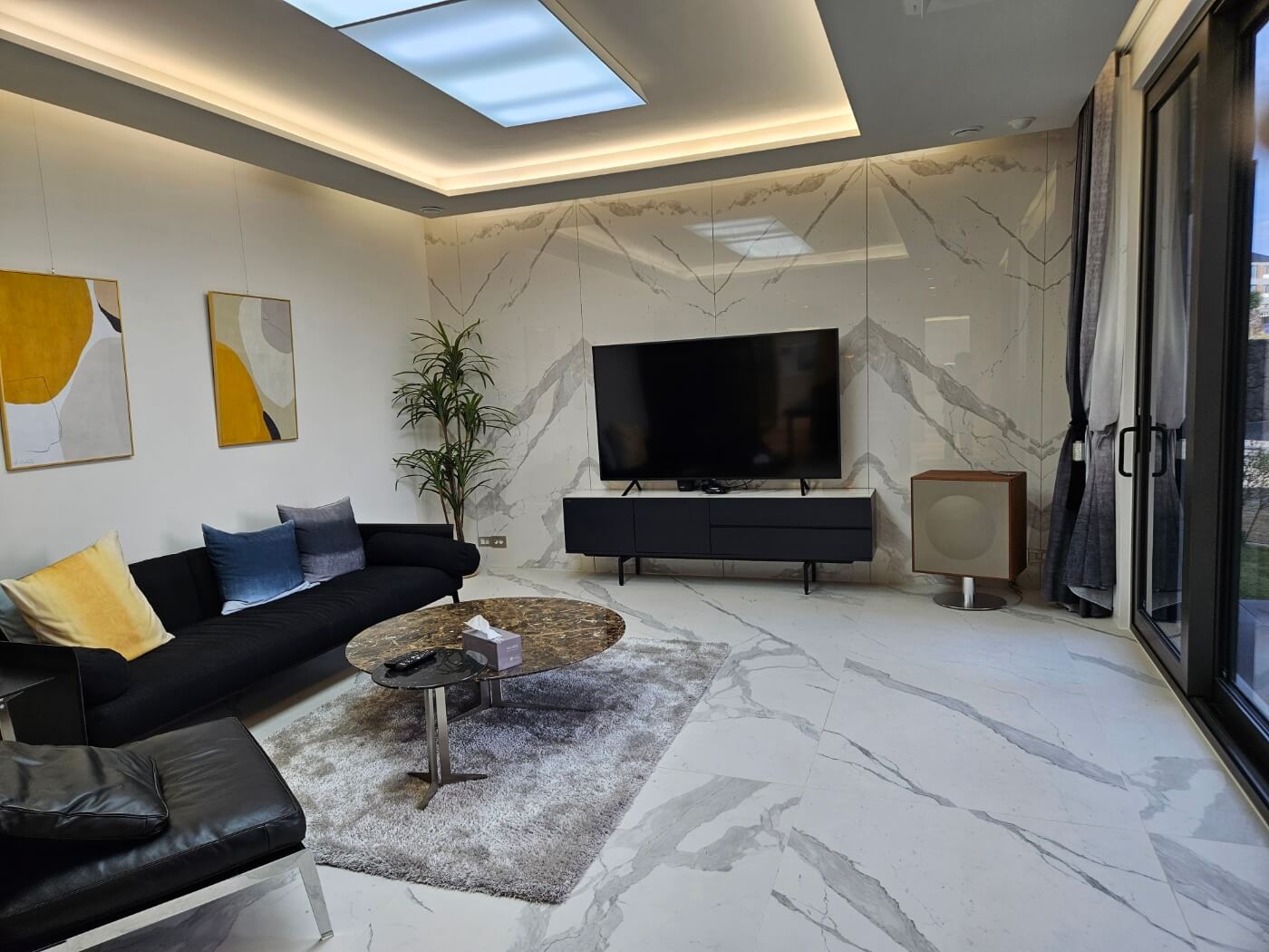 거실은 우물천장을 포함해 2.9m의 천장 높이로 개방감을 극대화했습니다. 중정을 통해 들어오는 자연광과 통창을 통해 여유로운 공간감을 느낄 수 있습니다. 바닥은 천연대리석 비앙코카라라로, 벽체는 이탈리아 1m x 3m 크기의 세라믹 타일로 마감되었습니다. 창호는 3중 Low-E 시스템 창호를 사용하여 방음과 방습 효과를 강화했습니다. 또한, 태양광 시스템이 설치되어 있어 전기세 절감 효과를 누릴 수 있으며, 열회수 환기장치를 통해 언제나 쾌적한 공기 질을 유지할 수 있습니다.