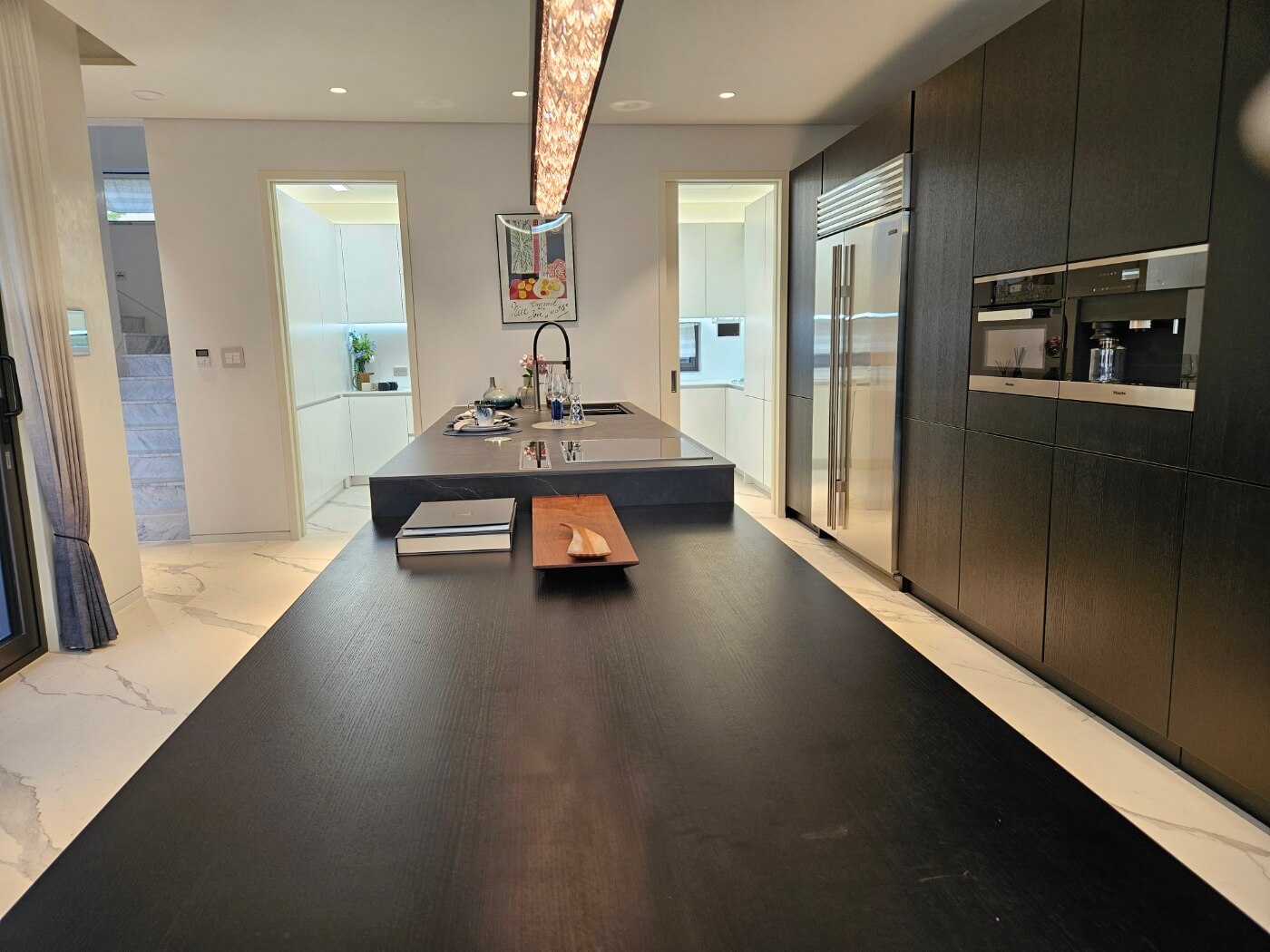 도어는 북유럽 노르웨이 오크 무늬목으로 제작되었으며, 이탈리안 세라믹 상판이 얹혀진 2.8m의 아일랜드 식탁과 함께 고급스러움을 더합니다. 또한, 보조 주방에는 LG 트롬 드럼 세탁기와 넉넉한 수납공간이 마련되어 있어 기능성과 실용성을 갖춘 공간입니다.