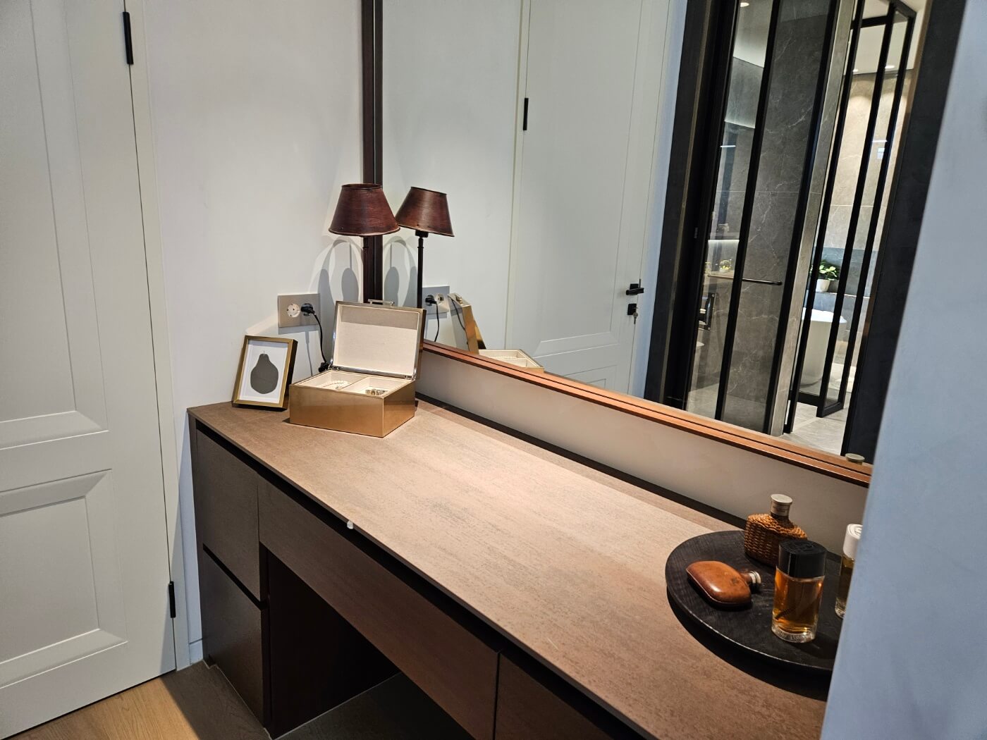 드레스룸은 북미산 월넛 무늬목 마감재를 사용했으며, 헤펠레 조명을 설치해 시각적 편안함을 제공했습니다.