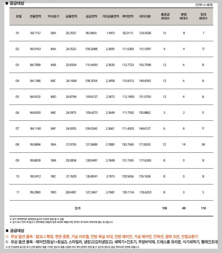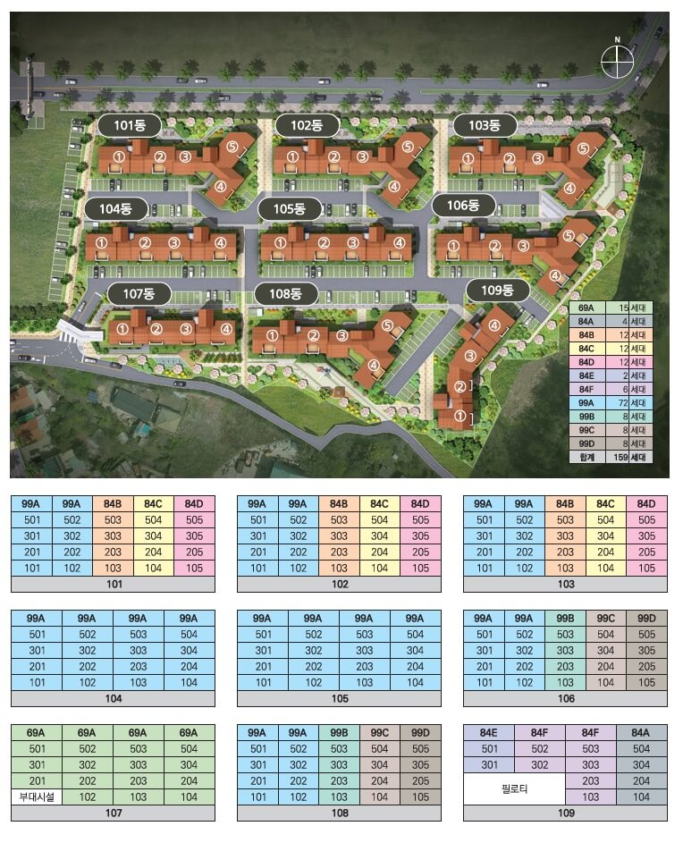 공급규모: 공동주택 지하 1층, 지상 4층, 다락방 7개 동(25실), 총 9개 동 159세대(일반분양공급 49세대, 장기임대공급 110세대