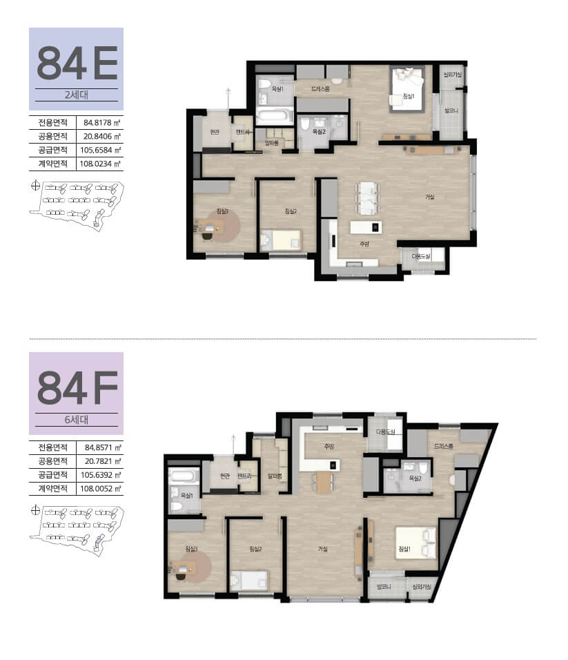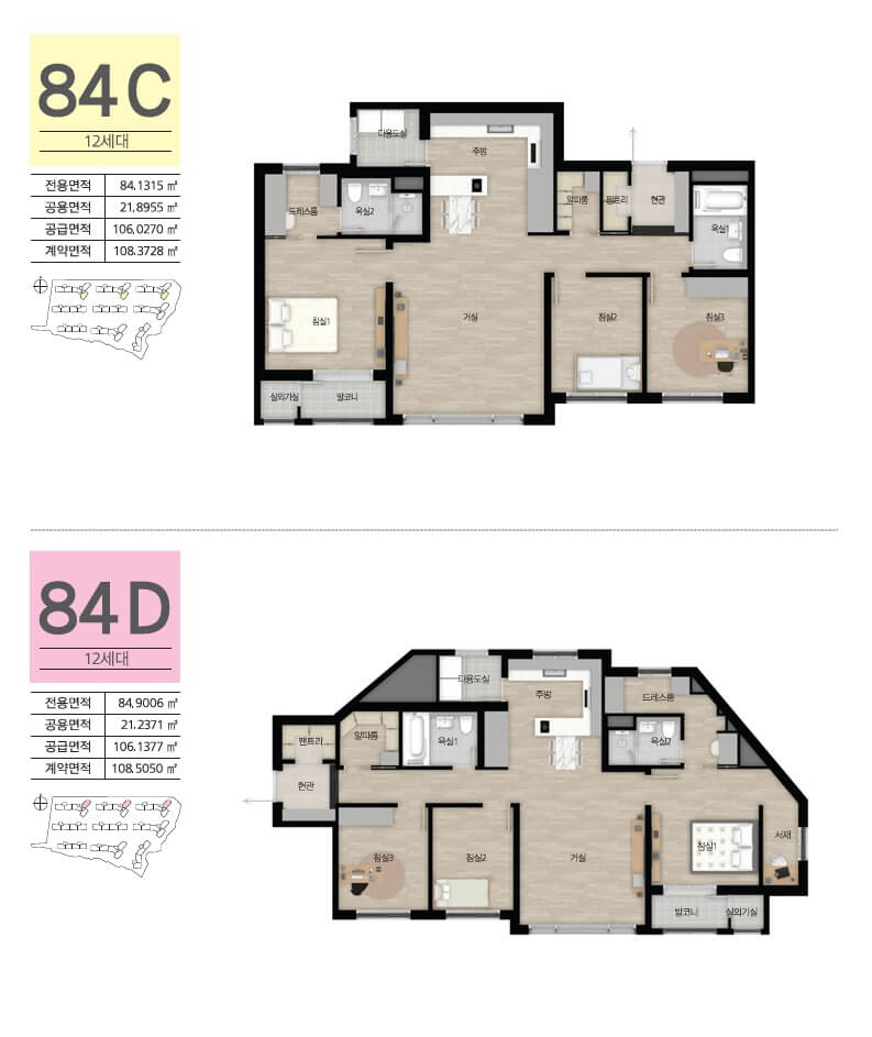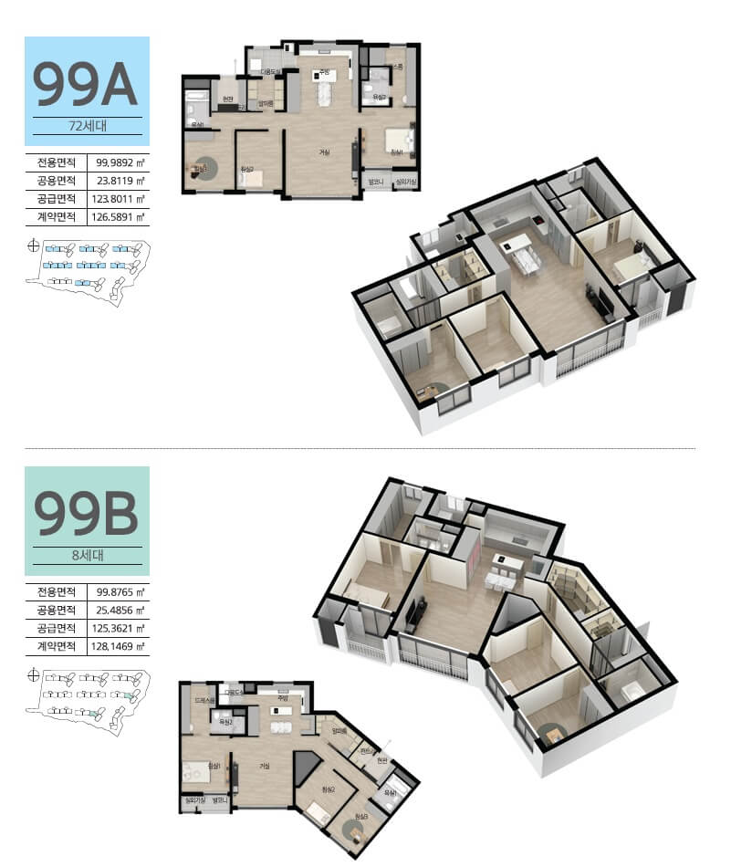북촌 PH159는 69㎡, 84㎡, 99㎡의 세 가지 타입으로 제공되며, 실사용 면적은 서비스 면적을 포함하여 넉넉하게 설계되었습니다. 효율적인 공간 활용이 돋보이는 구조로 거실, 주방, 보조주방, 드레스룸, 팬트리 등 입주민들에게 최적의 생활환경을 제공합니다. 특히 거실에서 보이는 푸른 잔디의 골프장 전망은 다른 단지에서는 찾기 어려운 특별한 장점입니다.