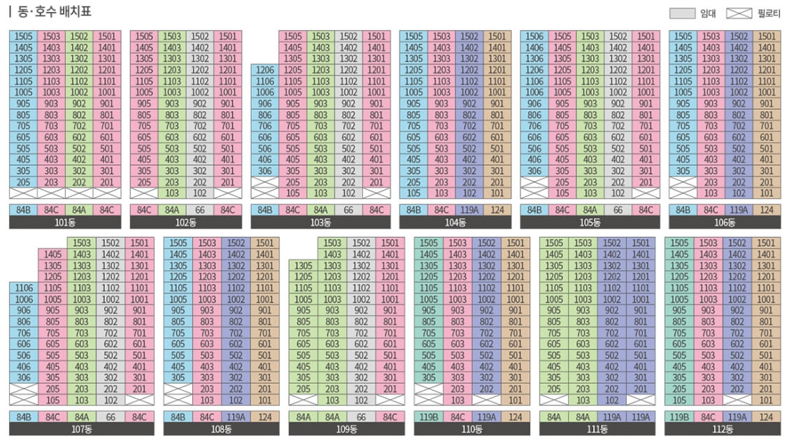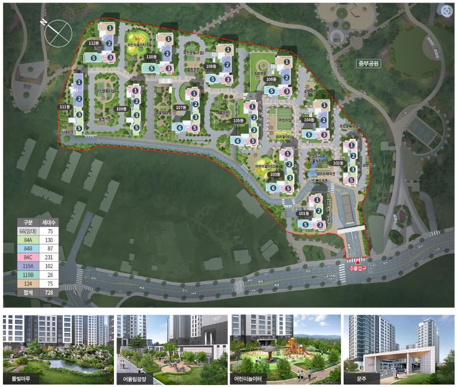 이 단지는 지하 4층부터 지상 15층까지, 총 12개 동으로 구성되어 있으며, 총 728가구가 분양됩니다. 전용면적은 66124㎡에 이르며, 일반분양은 전용 84124㎡의 653 가구로 이루어져 있습니다.