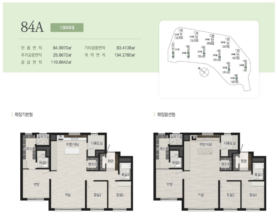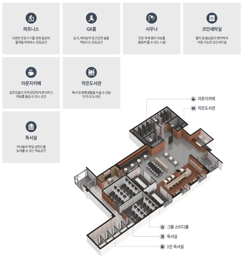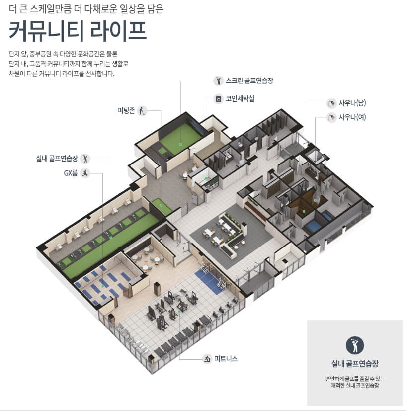 주거 단지는 4베이 판상형 구조로, 남향을 중심으로 배치되어 풍부한 일조량과 공원 조망을 제공합니다. 다양한 대형 커뮤니티 시설 또한 구비되어 있으며, 피트니스, GX룸, 사우나, 실내 골프연습장, 라운지 카페, 코인 세탁실 등을 이용할 수 있습니다.