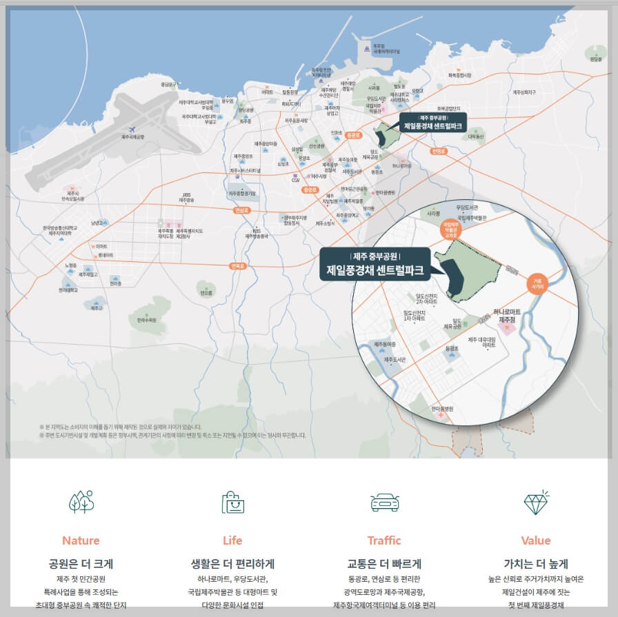 도심 접근성이 우수하며, 제주국제공항과 제주항국제여객터미널 등을 이용하기에도 편리합니다. 또한 주변에는 다양한 교육, 상업, 행정 등의 시설이 위치해 있습니다. 단지는 중부공원과 함께 연계해 조성될 예정이며, 중부공원은 약 17만㎡로, 숲과 화원, 하늘숲길, 야외 공연장, 체육시설 등이 조성될 예정입니다. 또한, 주변에는 다양한 상업 시설과 교육시설, 행정시설이 위치하여 생활의 편의성을 높여줍니다.