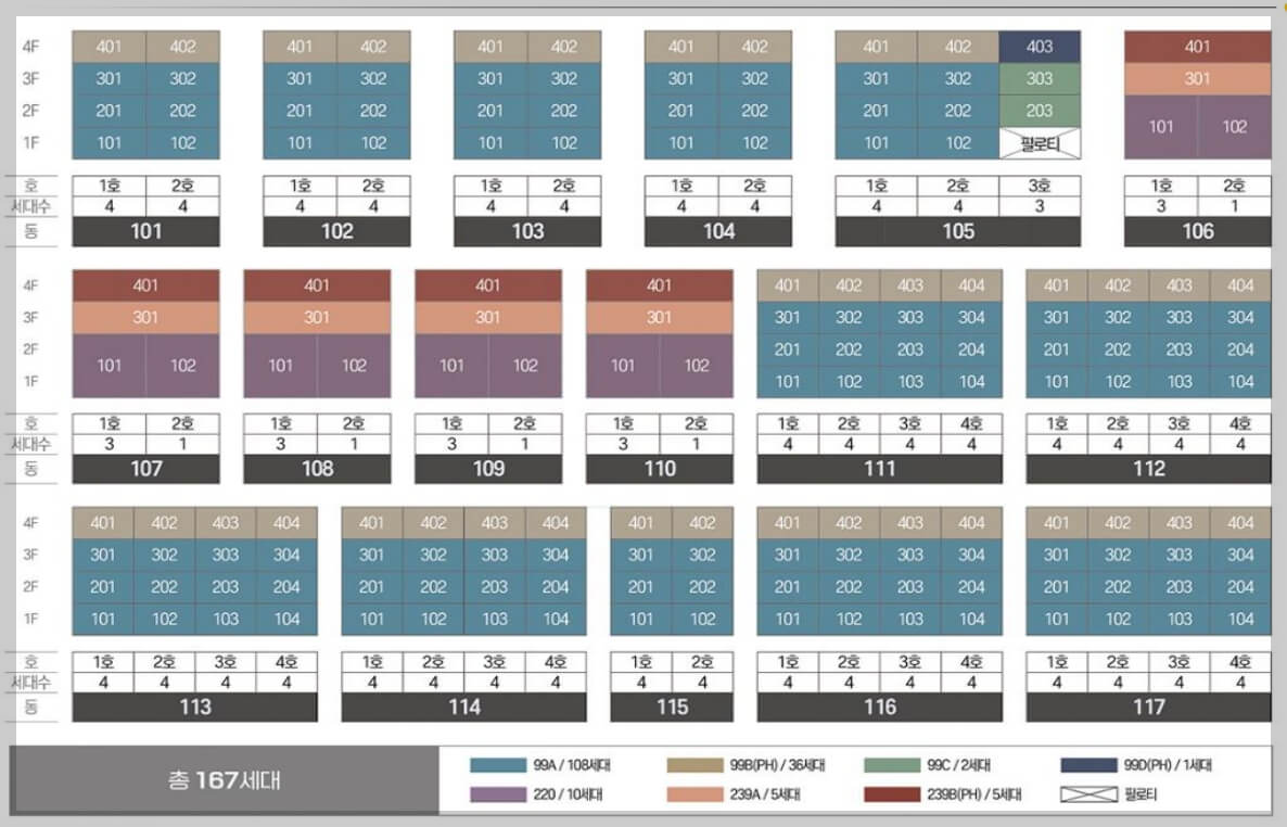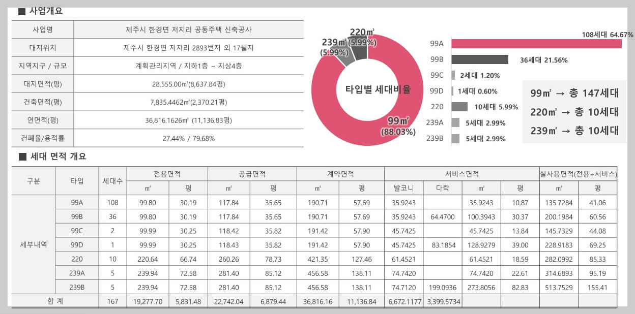 공동주택 전용 99㎡ 평형으로 약 88% 구성, 그 외 전용 220㎡ 이상의 대형 평형으로 구성