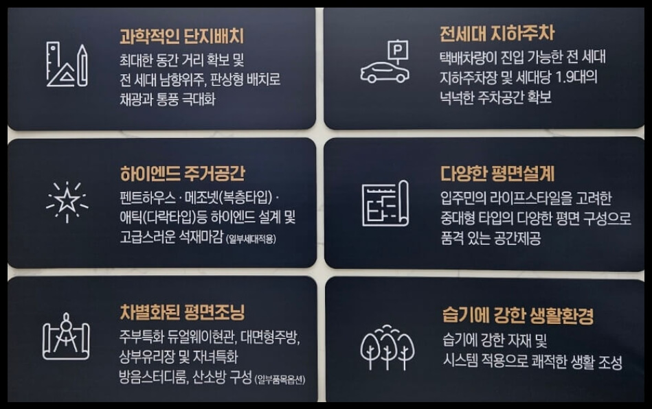 이 단지는 주부들을 위한 특별한 공간과 자녀교육을 위한 시설도 완비되어 있습니다. 주부특화 듀얼웨이현관, 대면형 특화주방, 그리고 방음스터디룸과 산소방 등의 시설은 입주민들에게 편안하고 안전한 생활환경을 제공합니다. 또한, 고품질의 마감재와 습기에 강한 자재를 사용하여 내부 인테리어의 퀄리티를 높였습니다.