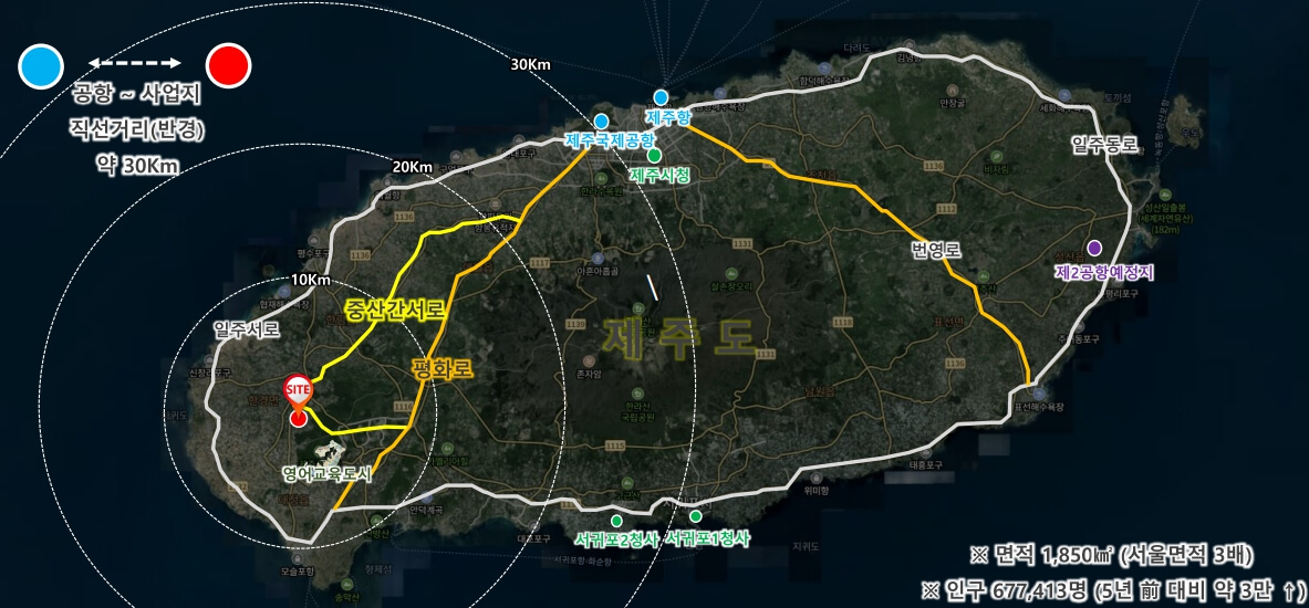 사업지부터 제주공항까지 반경 30km, 차량 이용 시 약 52분 소요