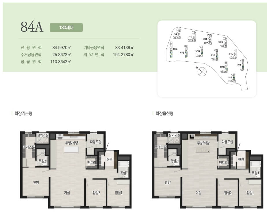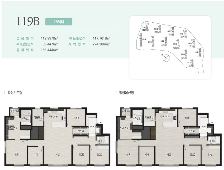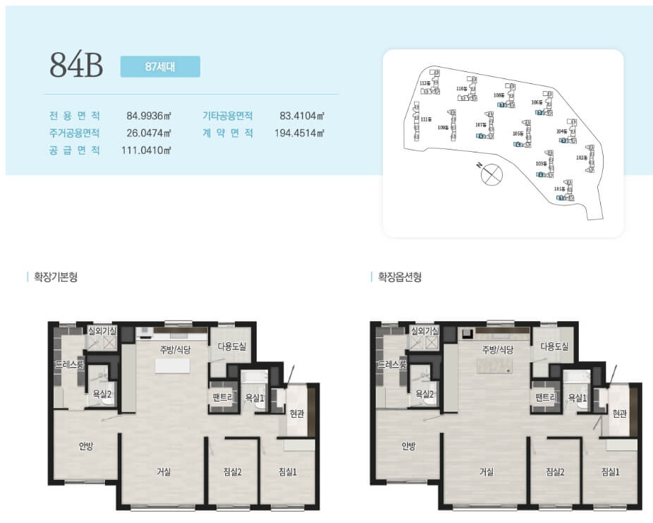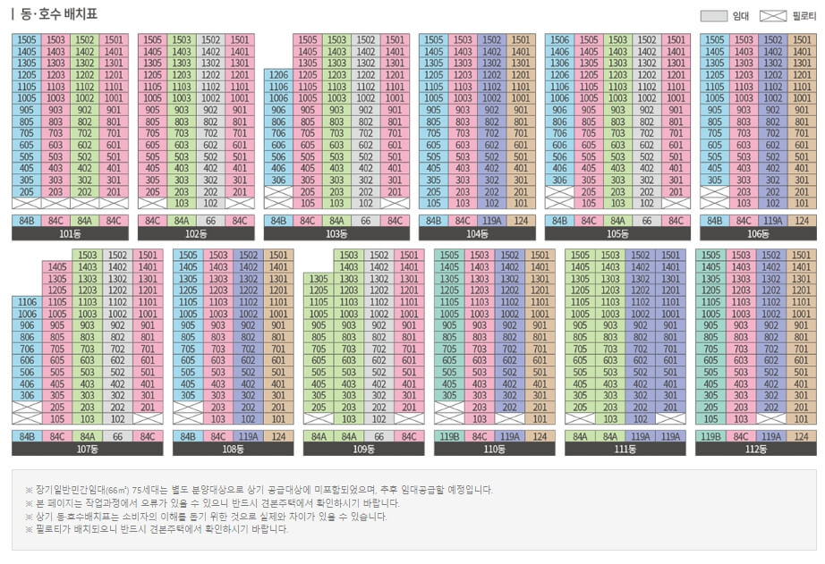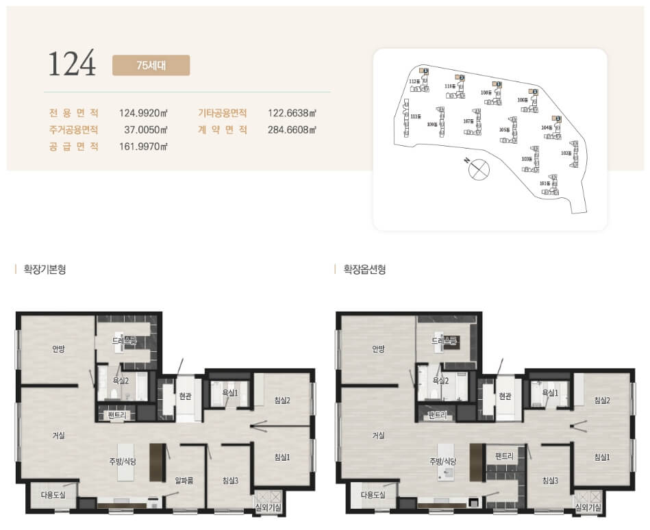 주거 공간은 전용면적 66~124㎡로 다양한 구성을 갖추고 있으며, 대부분의 가구가 4베이(방 3칸과 거실 전면 향 배치) 판상(-자) 형에 남향으로 배치됩니다. 또한, 드레스룸, 팬트리 등의 수납공간이 각 타입별로 제공될 예정입니다. 특히, 전용 119㎡A·B, 124㎡ 타입에는 알파룸이 추가 설계되며, 124㎡ 타입 중 일부는 서재가 추가됩니다.