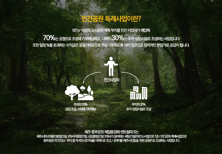 5만㎡이상의 도시공원 계획 부지를 민간 사업자가 매입해 70%는 공원으로 조성해 기부채납하고, 나머지 30%는 주거상업시설로 조성하는 사업입니다. 또한 일정 %를 초과하는 수익금은 공공기여금으로 무상기부하도록 되어 있으므로 합리적인 분양가로 공급이 됩니다.