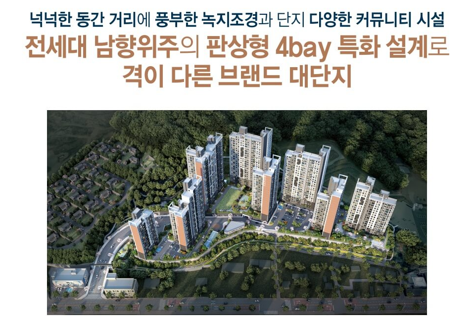 전 세대 남향 위주 배치로 채광과 통풍이 뛰어나며, 4 Bay 판상형 특화 설계로 실용성과 편리함을 극대화했습니다.