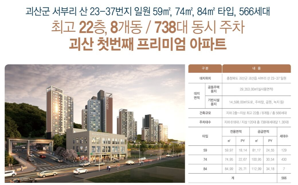 최근 부동산 시장에서 학세권 아파트의 인기가 날로 높아지고 있습니다. 학령기 자녀를 둔 젊은 세대들이 청약시장에서 큰 손으로 떠오르면서, 자연스럽게 집 근처에 학교가 가까운 단지에 대한 관심이 증가하고 있습니다. 실제로 2023년 전국 1순위 청약경쟁률 상위 10개 단지 중 7곳이 초등학교 인근에 위치한 학세권 아파트였습니다. 이러한 가운데 충청북도 괴산군에서 초·중·고 트리플 학세권을 자랑하는 괴산 에코시티가 공급될 예정입니다. 장기 분양형 아파트로 실수요자는 물론 투자자들에게도 매력적인 선택지가 될 전망입니다. 괴산 에코시티는 충북 괴산 서부지구 도시개발사업지(서부리 일원)에 들어서는 대규모 주거 단지입니다. 지하 2층~지상 22층, 총 8개 동으로 구성되며, 전용면적 59·74·84㎡의 3가지 타입 총 606세대가 공급됩니다. 특히, 단지 인근에 괴산명덕초, 괴산북중, 괴산고 등 초·중·고등학교가 위치하여 교육 여건이 뛰어납니다. 중원대와 괴산증평교육청도 가까워 교육 인프라가 잘 갖춰져 있어 학부모들의 관심이 높습니다.