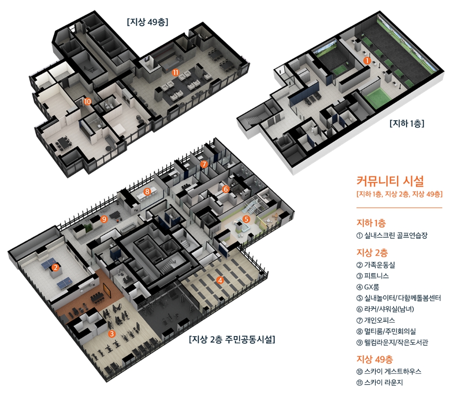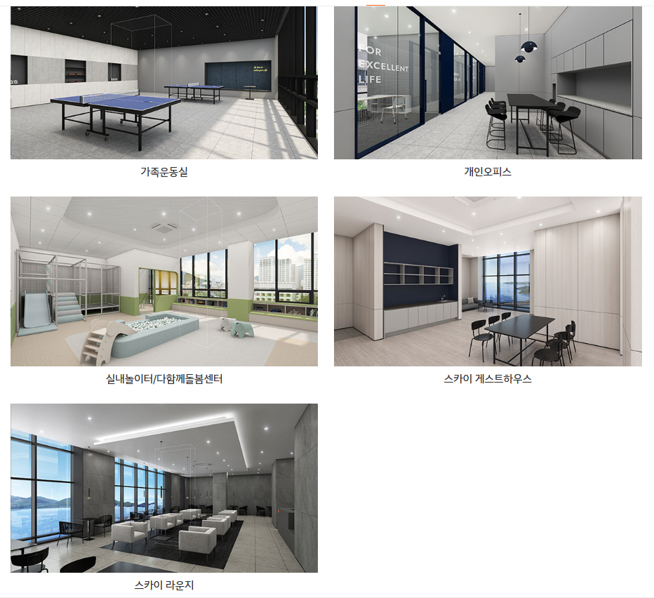 단지 내에는 스카이라운지, 스카이 게스트하우스, 로비계절정원, 어린이 물놀이터 등 다양한 커뮤니티 공간이 마련되어 있습니다. 또한, 실내스크린골프연습장, 피트니스, 다 함께 돌봄 센터, 키즈스테이션 등이 입주자들의 생활을 풍요롭게 만들어 줄 것입니다.